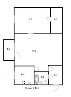 Квартира общей площадью - 45.6 кв.м + балкон. Квартира теплая, не угловая. Планировка смежно-изолированная. Комнаты: 19.2 + 11 кв м. В комнате 11 кв м есть кладовая (2.9 кв м), в которой можно оборудовать гардеробную. Кухня квадратной формы 6.4 кв м, газ. СУ просторный, совмещенный (3 кв м). Коридор 3.1 кв м, где можно установить узкий встроенный шкаф. Стеклопакеты на всех окнах. Все окна выходят в тихий зеленый двор на лицей. Пол - линолеум, паркет. Железная входная дверь. Квартира требует ремонта, но можно въехать и жить первое время. Оптимальное соотношение цены и качества при выборе данной квартиры позволит сэкономить на покупке и сделать ремонт полностью на свой вкус.