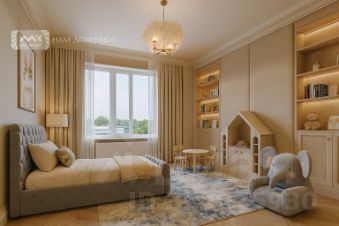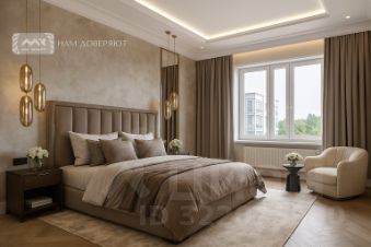 Кухня- гостиная с панорамными окнами в пол и выходом на террасу расположена в центре квартиры, справа и слева от гостиной две мастер- спальни с гардеробными и санузлами.