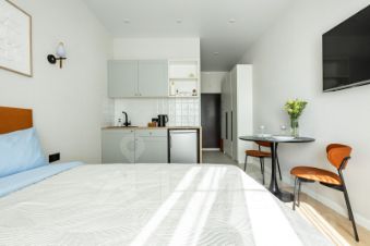 Благодаря продуманной планировке, в студии достаточно места для комфортного проживания.