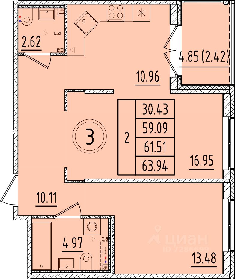 Общая площадь59,09 м²
