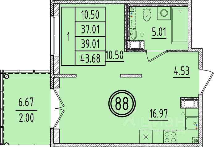 Общая площадь37,01 м²