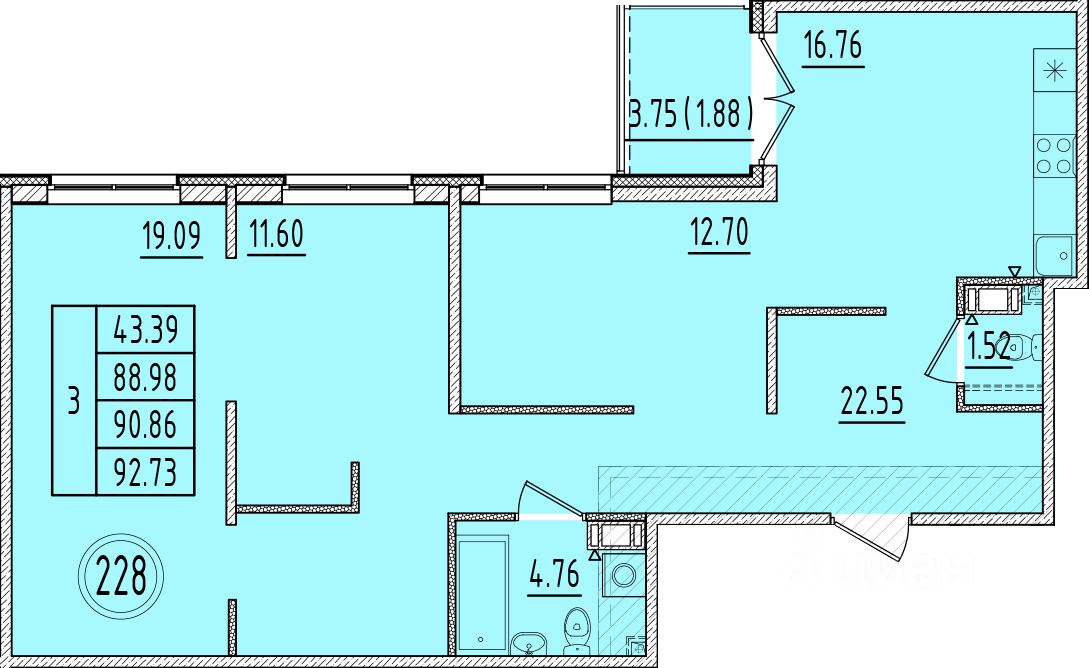 Общая площадь88,98 м²