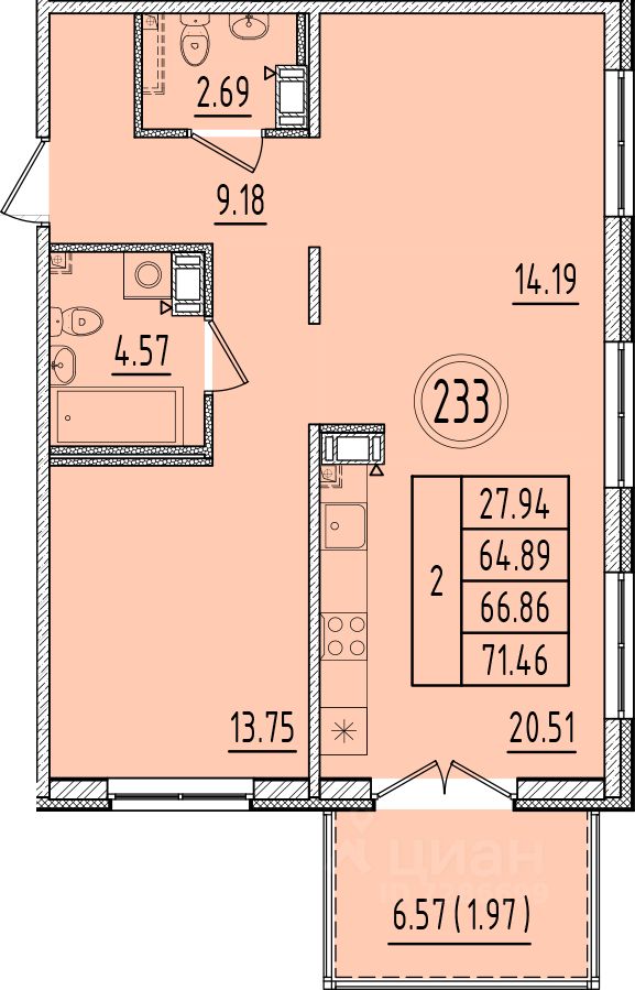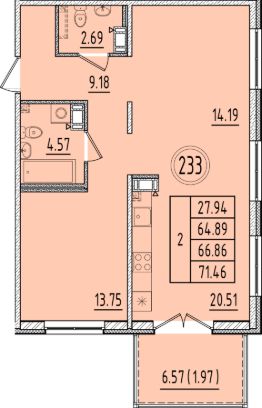 Общая площадь64,89 м²