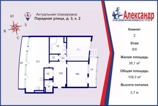 1704446 Квартира в ЖК "Парадный квартал" с панорамным видом на Смольный собор, исторический центр города, балконом-террассой 9 м2 и высокими потолками в 3,7 метра !