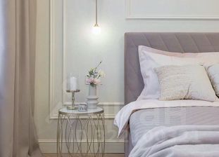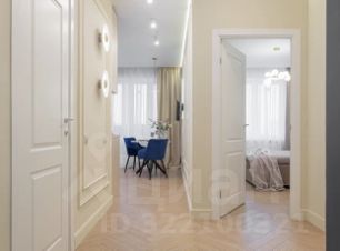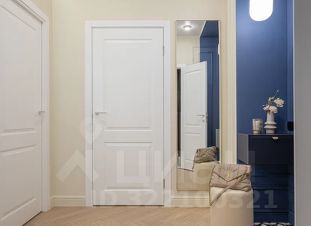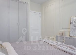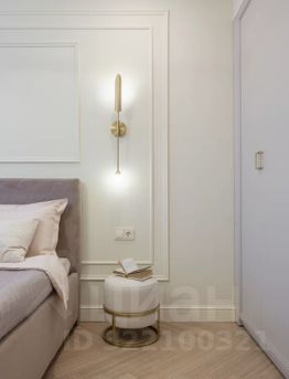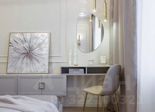 В квартире гардеробная, просторная спальня в светлых тонах, встроенный шкаф.