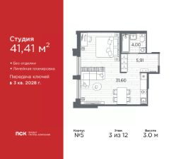 1-комн. квартира-студия от застройщика в Клубный квартал "Ассамблея" на 3 этаже. Квартира без отделки, после оформления собственности можно делать ремонт. Общая площадь: 41.41 кв.м., площадь гостиной 31.6 кв.м., из которых 10 кв.м. выделено под кухонную зону. Все окна выходят на одну сторону. В квартире один совмещенный санузел. Высота потолков 3.0 м.