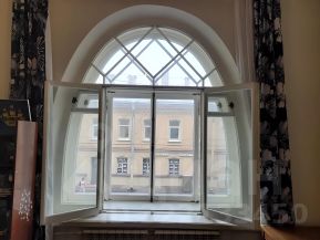 Большие арочные окна отреставрированы и выходят на тихую Мытнинскую улицу (ездит только один троллейбус).