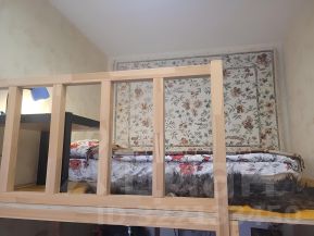 В квартире две большие комнаты (была 3-х комнатная, снесена советская стенка в одной из комнат, которая делила исторически большую комнату на 2 маленькие). В одной из комнат создан дополнительно 2 этаж со спальной зоной и рабочим местом, что увеличивает площадь квартиры.