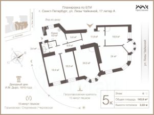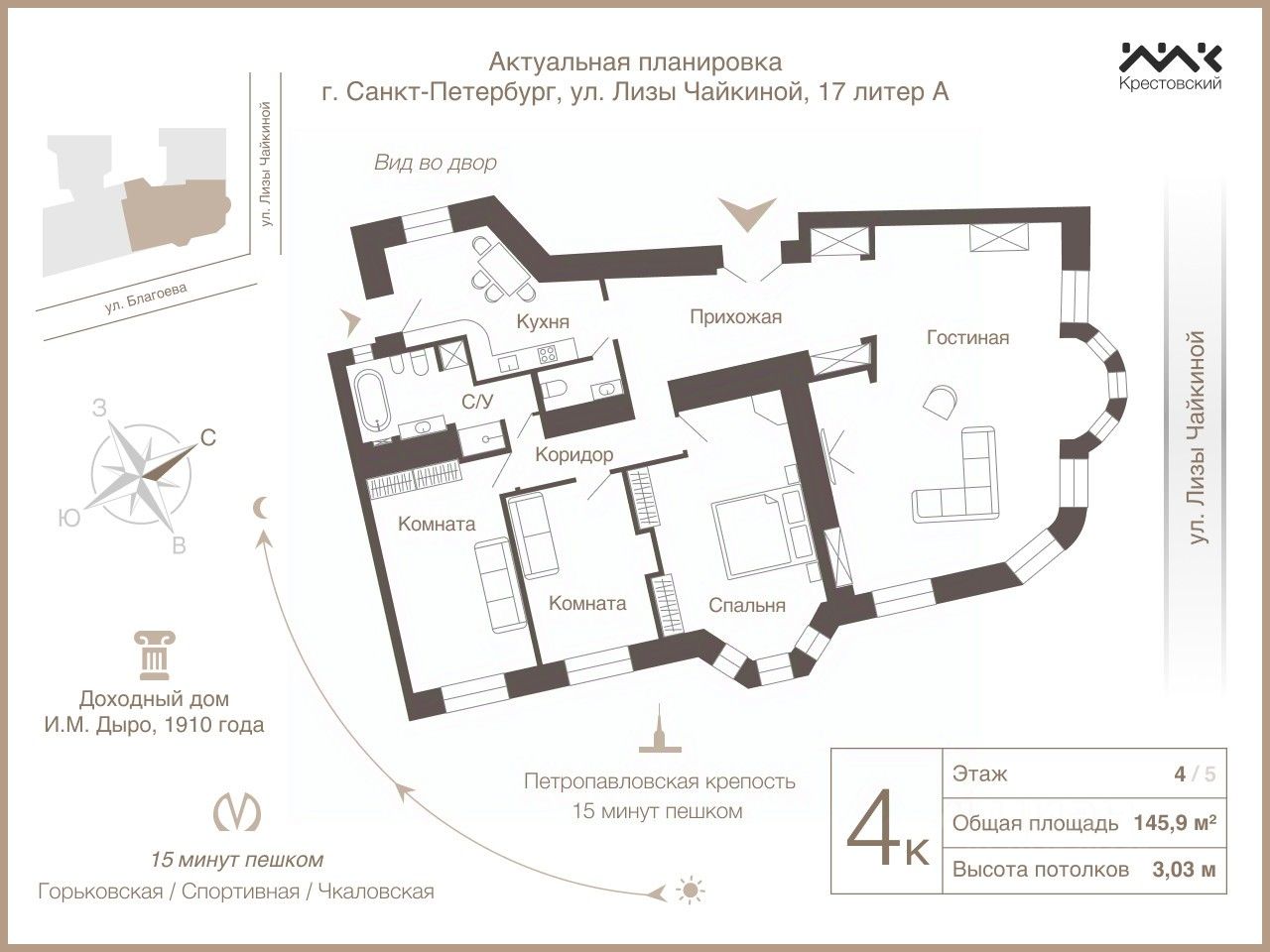 Уникальная трёхсторонняя планировка с двумя входами — с улицы Лизы Чайкиной через парадную и со двора — создаёт дополнительные возможности для зонирования.