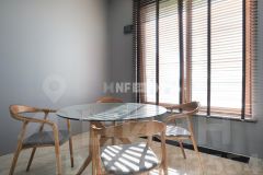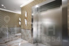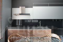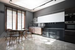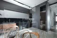 Интерьер выполнен в минималистичном стиле с использованием натуральных материалов — пол выполнен из кварцита. Кухня Valcucine укомплектована встроенной техникой Miele. Для поддержания комфортного микроклимата установлена система канального кондиционирования. Окна квартиры ориентированы на запад и выходят в тихий внутренний двор.