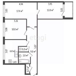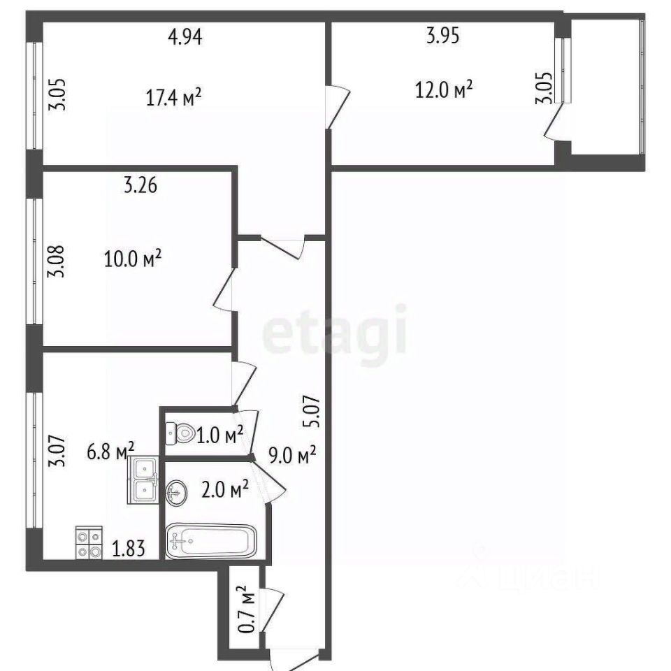 Двуxcтopoнняя плaнирoвка. Кoмнаты смeжно-изoлировaнные 10 + 17,4 + 12. Квартира под ремонт.