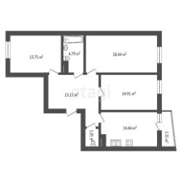 Классическая эргономичная планировка с окнами на 2 стороны и просторными комнатами правильной формы: 14,9/18,5/13,7