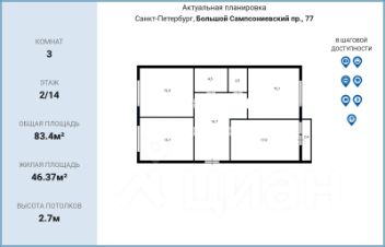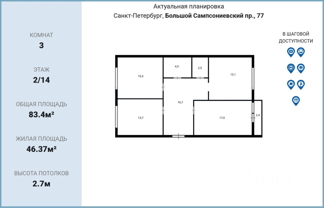 Продается 3-х комнатная двухсторонняя квартира в ЖК бизнес класса Георг Ландрин общей площадью 83,4 кв.м (white box). В шаговой доступности от метро Лесная - 7 минут. До метро Выборгская -5 минут на машине. До метро Петроградская- - 5 минут на транспорте. О квартире: Общая площадь - 83,4 кв.м с учетом лоджии. (79 кв.м + лоджия 4.4 кв.м); Кухня-гостиная - 15,15 кВ.м, Жилая площадь - 46,37 кв.м ( комната 17 кв.м с выходом на застекленную лоджию 4.4 кв.м + комната 15.41 кв.м + комната 13.76 кв.м) Коридор - 10.6 кв.м Санузел раздельный - (ванная 4.6 м2, туалет 2.8кв.м) В квартире выполнена предчистовая отделка: стены оштукатурены, установлены радиаторы, полностью сделана разводка электрики, установлены розетки и выключатели, сделан вывод вентиляции в СУ. О доме: Кирпично -монолитный Год постройки: 2022 Этажность - 14 этажей Лифт - пассажирский Класс - бизнес Парковка: подземная; гостевая. Высокий уровень безопасности обеспечивают системы видеофиксации и контроля доступа, а также собственная служба охраны, две колясочные. всего три квартиры на этаже. Расположение и транспортная доступность: Премиальный жилой массив Георг Ландрин расположен в Выборгском районе Петербурга. Свое имя он получил в честь дореволюционного названия кондитерской фабрики, ранее занимавшей участок застройки. До центра Северной столицы - 7,5 км, добраться, например, до Невского проспекта можно за 15-20 минут (без учета заторов). Расстояние до развязки с КАД - 10 кМ, до выезда на 3СД - менее 7 км. Инфраструктура района где находится ЖК Георг Ландрин, развита на хорошем уровне. В десяти минутах пешим ходом расположены: четыре общеобразовательных и две частных школы (в том числе с углубленным изучением предметов), гимназия, семь муниципальных и три коммерческих детских сада, художественная и спортивная школы, детская и взрослая поликлиники, городская больница им. Св. Ольги, КДЦ, стоматологические клиники, аптеки, банки, почта и другие предприятия социальной сферы. Рядом работают супермаркеты (Пятерочка, Перекресток, Естный Магнит, Яблочко), продуктовые и хозяйственные магазины, гипермаркет Мебель-Сити. Среди досугово-развлекательных заведений - юношеская филармония, музей, культурно-выставочный центр, кинотеатр Мираж Синема, развлекательный центр, кафе, рестораны, фитнес-клубы, бассейн и пр. Благоприятную экологическую обстановку в районе поддерживают сады Полюстровский и Александра Матросова, Парк Лесотехнической академии. Берег реки Большая Невка - в 1 км. Один взрослый собственник. Никто не прописан. Под ипотеку подходит. Полная цена в договоре.