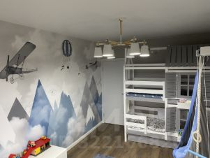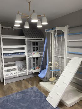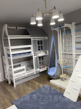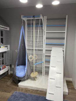 В третьих, идеальная детская комната для 1-2 детей с рабочей и игровой зоной, спортивным комплексом с шведской стенкой, тарзанкой, боксерской грушей, подвесными качелями, с двухъярусной кроватью для двух детей