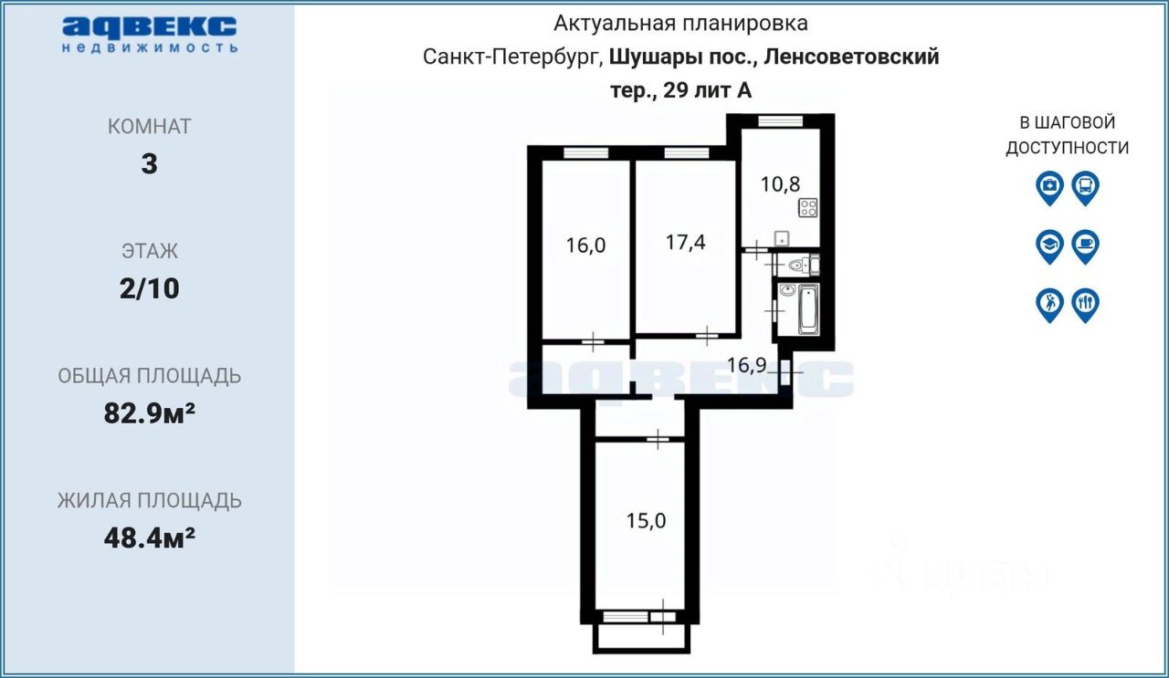 Пространство для счастья вашей семьи! Яркая 3-комнатная квартира в Пушкинском районе Санкт-Петербурга.