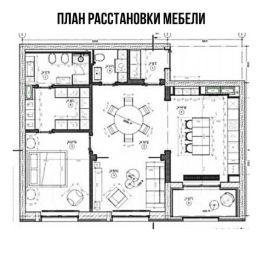-идеально зонированная кухня-гостиная общей площадью 42 квадратных метра. В ней расположена кухонная зона с барной стойкой с выходом на лоджию,столовая зона с круглым столом на 6 персон и зона для отдыха с диваном и креслом.