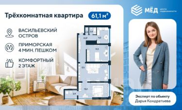Трехкомнатная квартира на Васильевском острове, в 4 минутах от метро Приморская