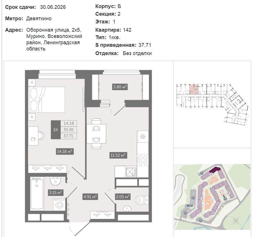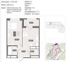 Квартира площадью 37,71 м², с комнатой 14,18 м² и просторной кухней 11,52 м². Санузел раздельный, есть лоджия. Расположена на первом этаже - удобно для семьи с детьми, пожилых людей или просто тех, кто не любит ждать лифт. Из окон открывается приятный вид на парк, рядом нет шумных дорог в квартире будет тихо и спокойно.
