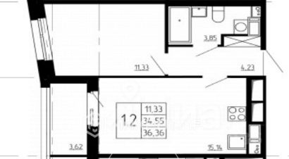 -Просторная кухня-гостинная-15.14 м.кв. с выходом на застеклённую лоджию - 3.62 м.кв. Уютная комната - 11.74 м.кв. Площадь прихожей 4.23 м.кв.