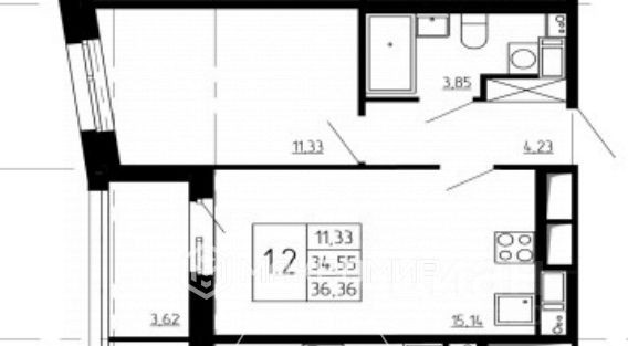 -Общая площадь 34.55 м.кв., приведённая вместе с балконом 36,36 м.кв.