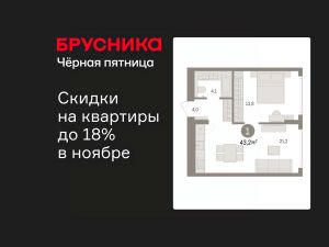 Однокомнатная квартира от застройщика с предчистовой отделкой в ЖК "Брусника в Новоселье" на 1 этаже. Общая площадь: 43.15 кв.м., жилая: 13.5 кв.м., площадь просторной кухни-столовой: 21.2 кв.м. Все окна выходят на одну сторону. В квартире один совмещенный санузел. Высота потолков 2.7 м.