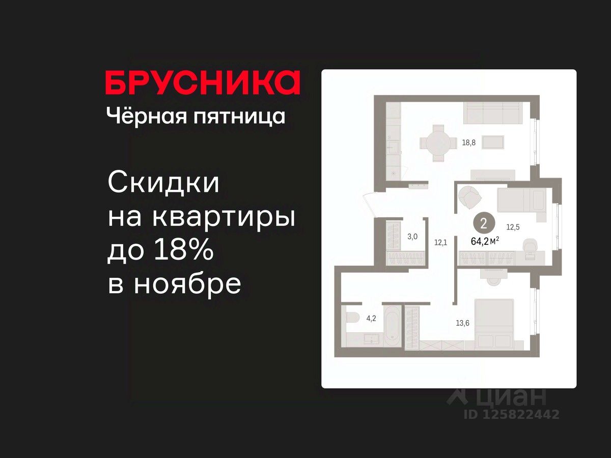 Просторная 2-комн. квартира с предчистовой отделкой в ЖК "Брусника в Новоселье" на 2 этаже. Общая площадь: 64.15 кв.м. Высота потолков 2.7 м.