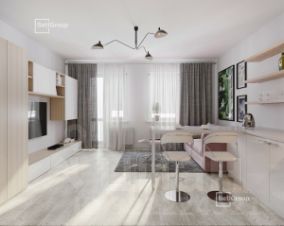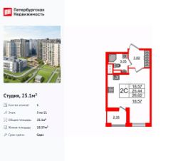Удобная, классическая, функциональная европланировка, просторная прихожая 3.82 м². Общая площадь студии - 25.1 м², жилая 18.57 м², высота потолка 2.75 м.