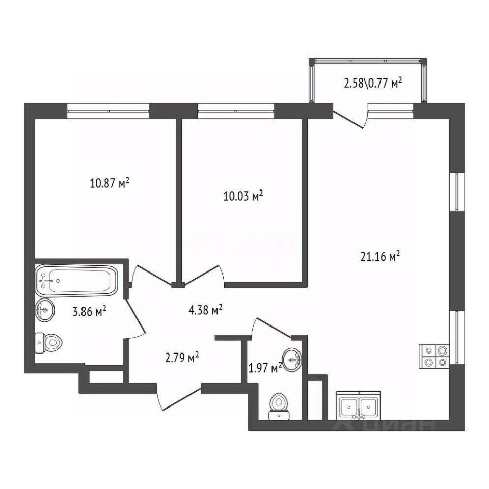 3-евро квартира, 55 кв.м, 13 этаж, потолки 2.75, шикарная кухня-гостиная 21 кв.м