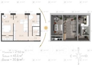 - комнаты смежные 19,4м2 + 11,2м2 с гардеробом. Их можно изолировать