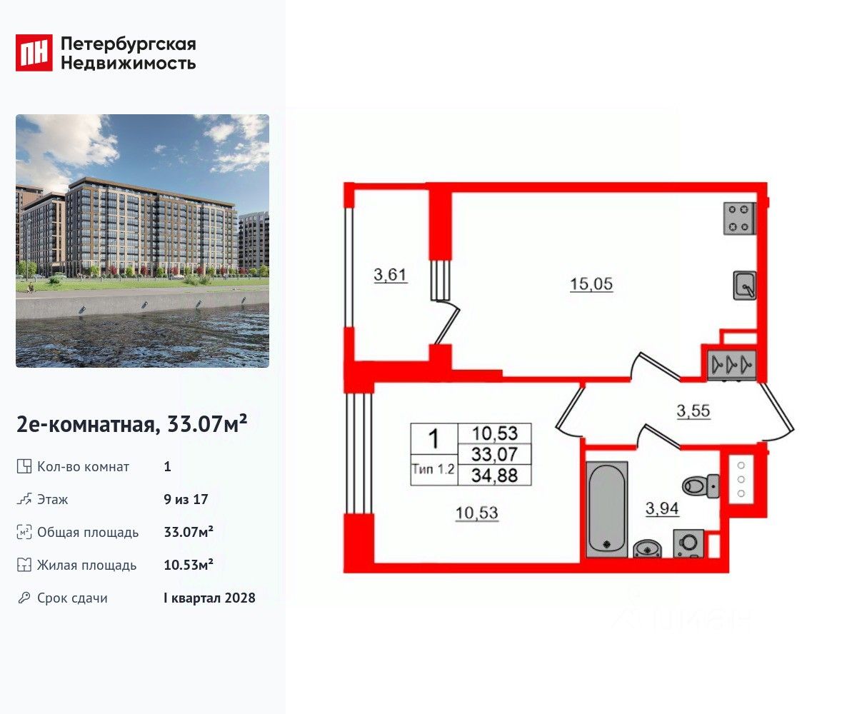 Удобная, классическая, функциональная европланировка, большая кухня-гостиная 15.05 м², вместительная прихожая 3.55 м². Общая площадь квартиры - 33.07 м², жилая 10.53 м², высота потолка 2.77 м.