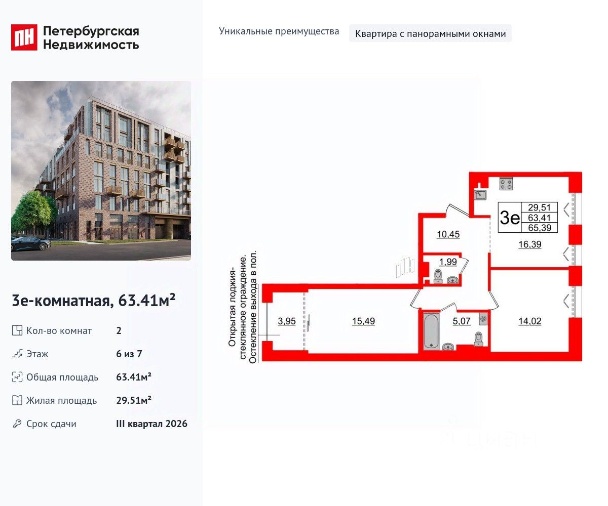 Уникальная, функциональная европланировка, большая кухня-гостиная 16.39 м², просторная прихожая 10.45 м². Общая площадь квартиры - 63.41 м², жилая 29.51 м², высота потолка 3 м.