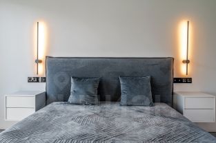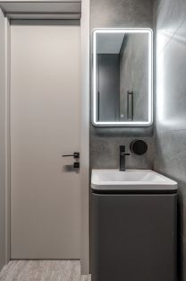Увеличенные двери: высота входной двери — 2,4 м, межкомнатных — 2,3 м. Это создаёт эффект простора и подчеркивает статус жилья