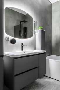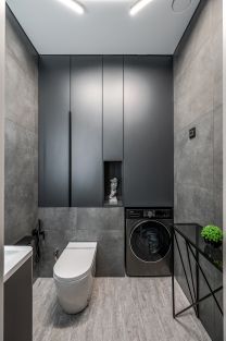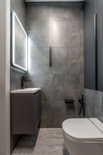 Санузлы с тёплыми полами, установленной сантехникой премиум-бренда Abber, а также безбачковыми унитазами с импульсным смывом — максимум эстетики и удобства.