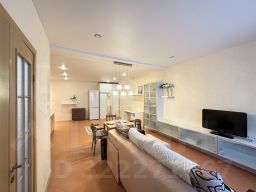 - Кухня-гостиная с выходом на большую лоджию, установлена варочная панель и вытяжка, тёплые полы.
