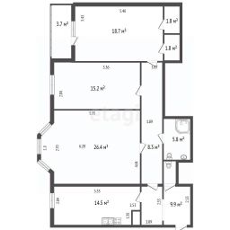 Планировка: просторная гостиная 26 м² с распашными дверями в кухню 14,5 м², две изолированные спальни (одна с гардеробной), два санузла. Высокое качество дома: толщина стен 80 см, три лифта, консьерж, видеонаблюдение, ухоженная территория, хорошее ТСЖ.