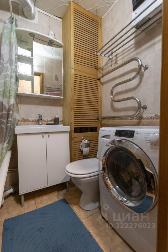 Санузел совмещенный, выполнен в нейтральных оттенках, коммуникации аккуратно спрятаны за декоративным шкафом, здесь же установлена стиральная машина, есть настенная сушилка и зеркало с подсветкой. Колонка работает исправно, не доставляя дискомфорта жильцам.