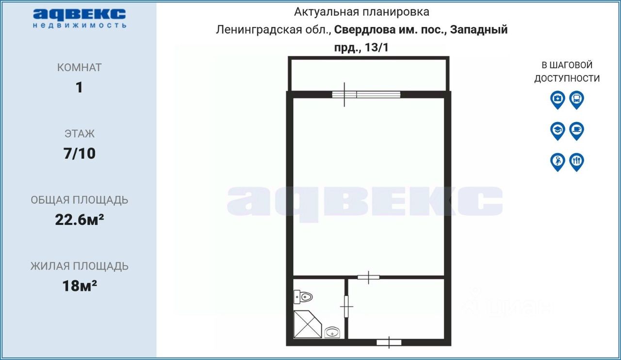 Квартира расположена на седьмом этаже десятиэтажного дома. Жилая комната правильной квадратной формы. Высокие. 2.75м. потолки. Окна выходят на юго- западную солнечную сторону. С лоджии открывается вид на Неву.