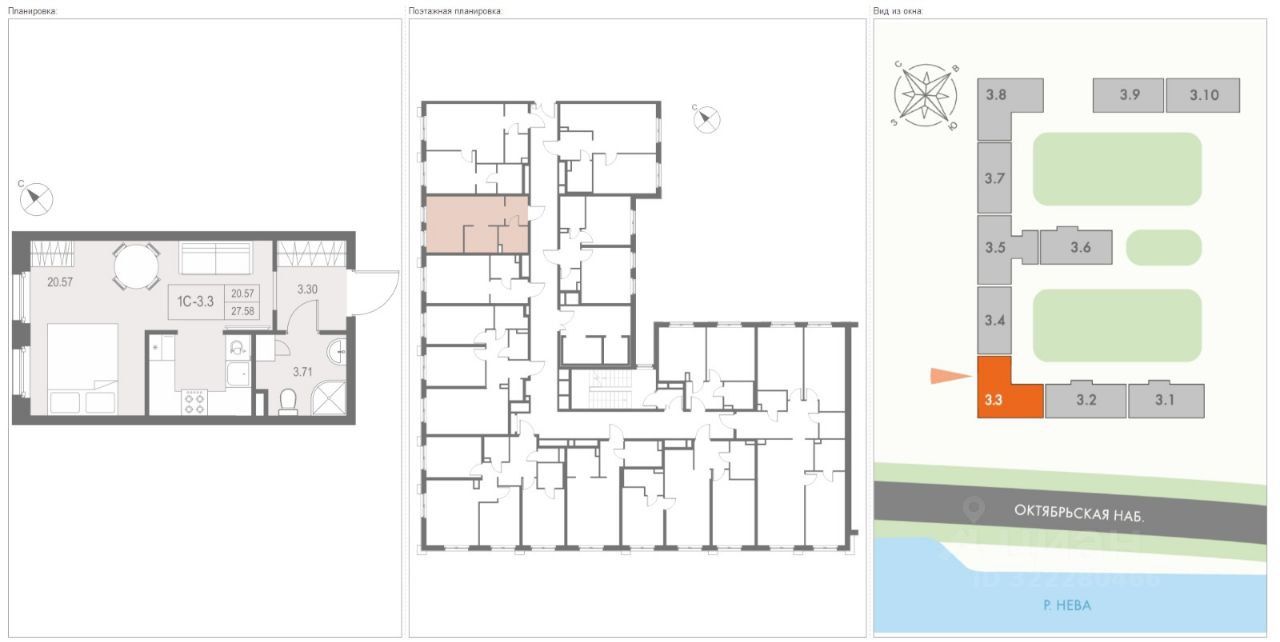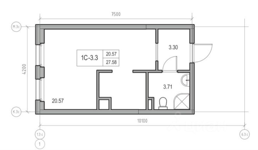 Общая площадь квартиры студии, расположенной на 3-м этаже 27.58м2. Площадь комнаты 20.57м2. Просторная прихожая 3.30м2, санузел 3.71м2.
