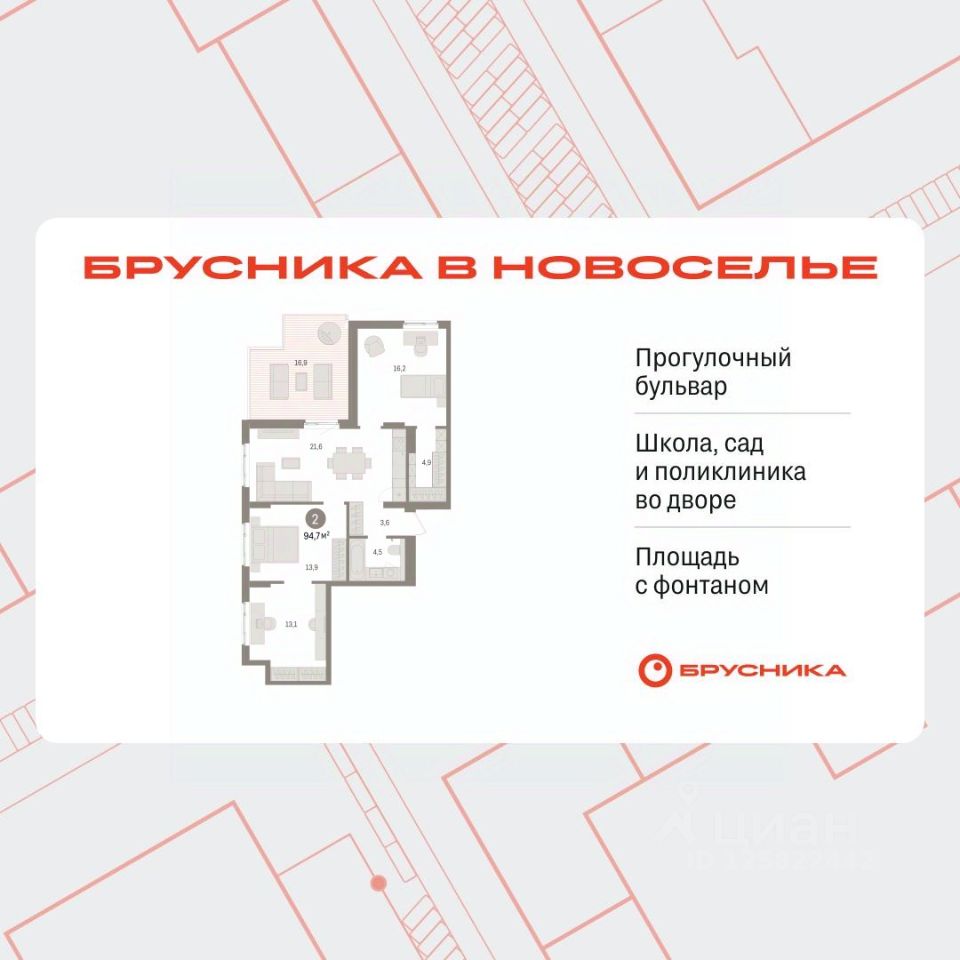 Продается 2-комн. квартира от застройщика с предчистовой отделкой в ЖК "Брусника в Новоселье" на 9 этаже. Общая площадь: 94.65 кв.м. Высота потолков 2.7 м.