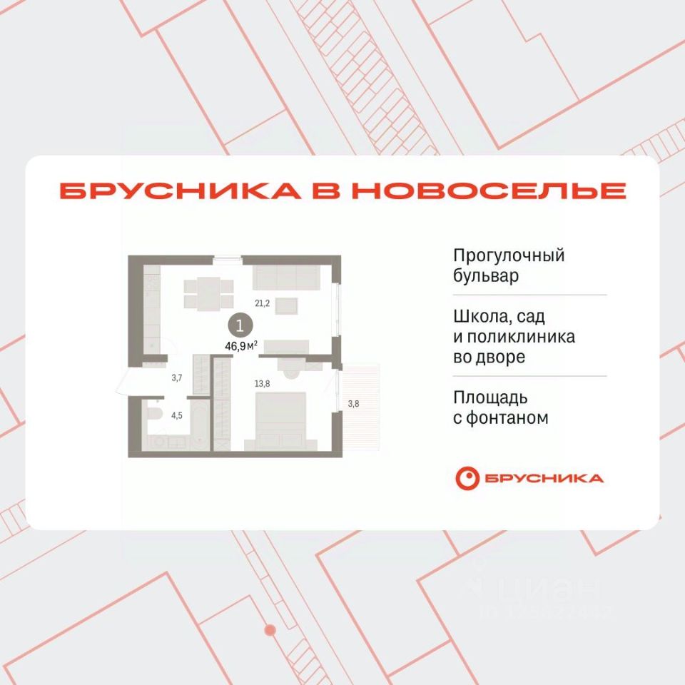 Однокомнатная квартира с предчистовой отделкой в ЖК "Брусника в Новоселье" на 8 этаже. Общая площадь: 46.92 кв.м. Высота потолков 2.7 м.