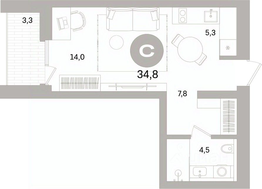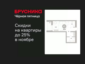 1-комн. квартира-студия от застройщика с предчистовой отделкой в ЖК "Северный ветер" на 4 этаже. Общая площадь: 34.81 кв.м., площадь гостиной 19.3 кв.м., из которых 5.3 кв.м. выделено под кухонную зону. Все окна выходят на одну сторону. В квартире одна лоджия, один совмещенный санузел. Высота потолков 3.1 м.