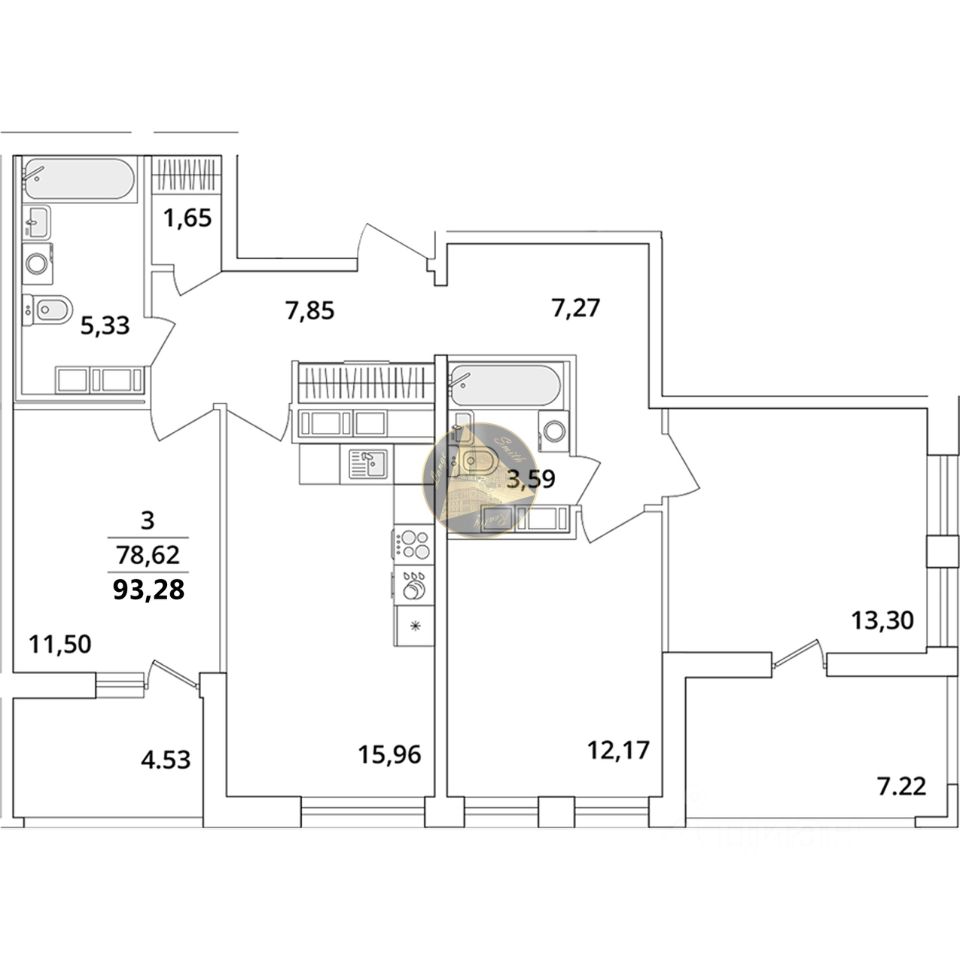 - 2 совмещённых санузла 3.59 и 5.33 м2