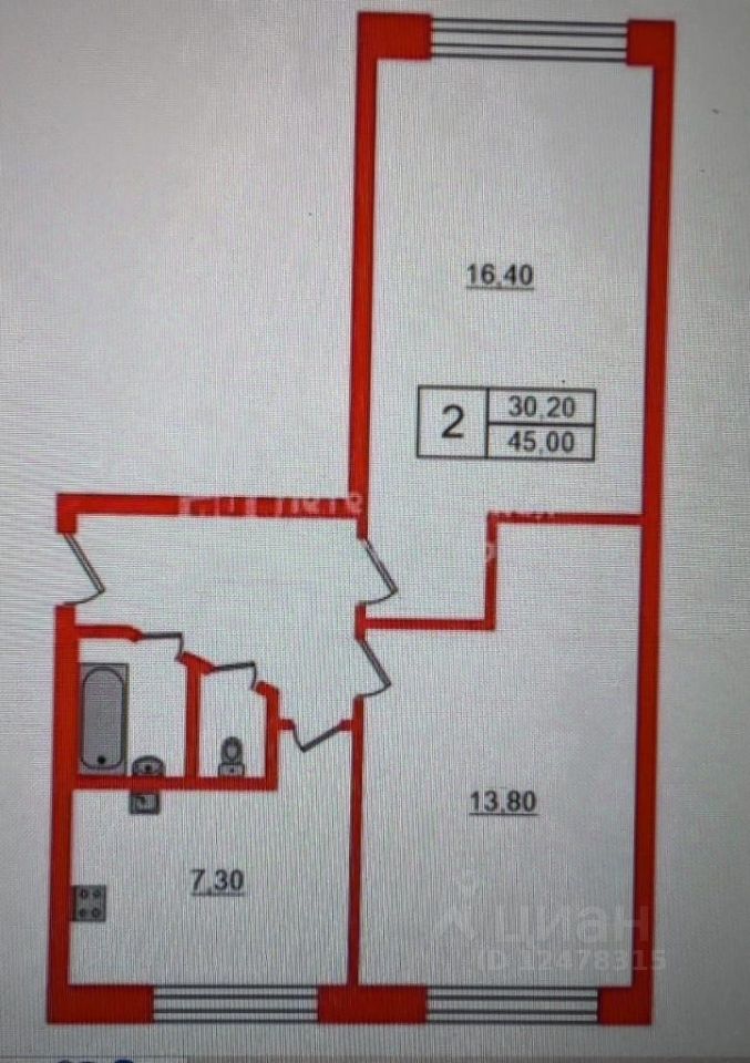 Квартира 45 м.кв., комнаты 13.8 и 16,4 м.кв, кухня 7,3 м.кв.