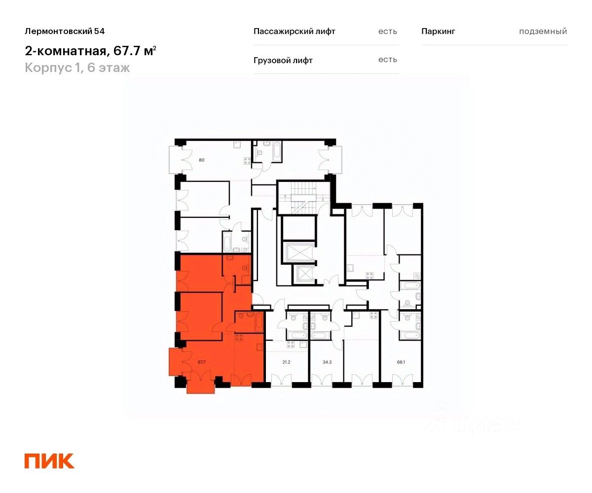 Продаётся 2-комн. квартира площадью 67,4 кв.м на 6 этаже 9 этажного дома (Корпус 1, Секция 3) проекта ПИК Лермонтовский 54. Светлый просторный подъезд на уровне земли, функциональная планировка, большие окна, предчистовая отделка.