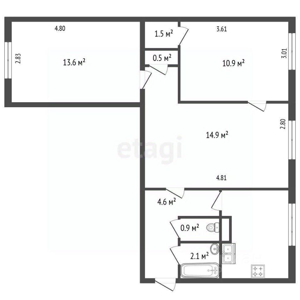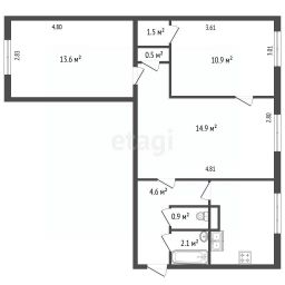 Общая площадь квартиры: 54 кв. м. Две комнаты изолированные.