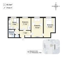 • Общая площадь — 66,6 м², удачная планировка: каждая комната просторна и функциональна.