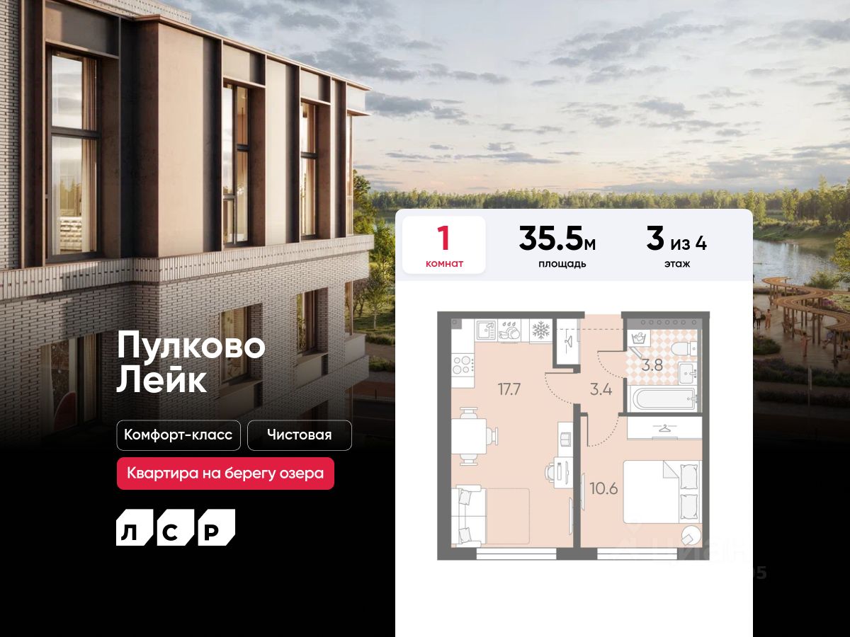 Продается 1-комнатная квартира в ЖК "Пулково Лейк" на 3 этаже. Общая площадь составляет 35.50 кв. м. Квартира с чистовой отделкой. Жилой комплекс "Пулково Лейк" располагается по адресу Санкт-Петербург, Московский.