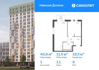 Строим кварталы для жизни с заботой о будущем. Предлагается 1-комнатная квартира комфорт-класса 40,93 кв.м в корпусе 1.1 на 9 этаже, в ЖК "Невская Долина"