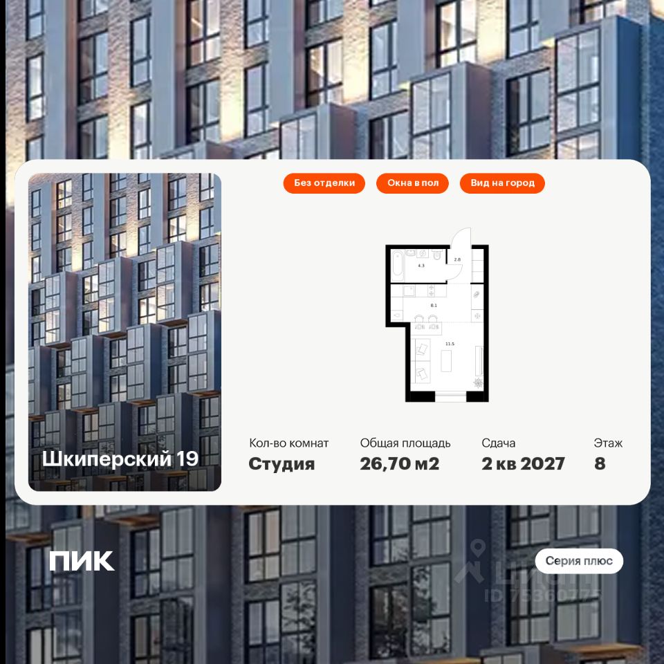 Продаётся квартира-студия площадью 26,7 кв.м на 8 этаже 12 этажного дома (Корпус 2, Секция 1) проекта ПИК Шкиперский 19. Светлый просторный подъезд на уровне земли, функциональная планировка, большие окна, без отделки.