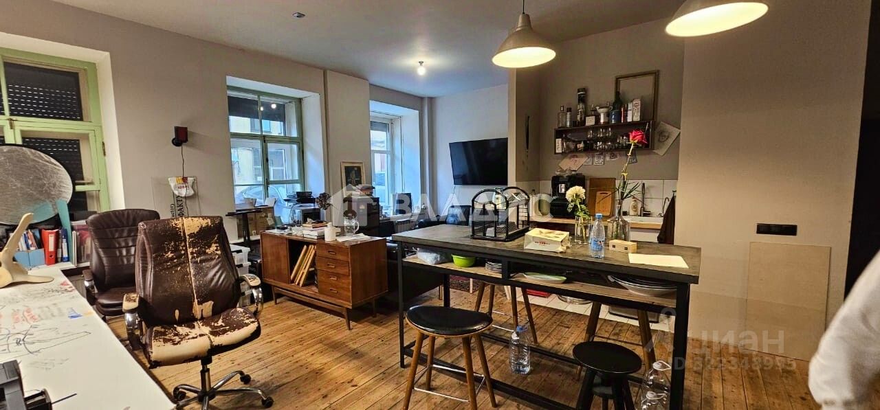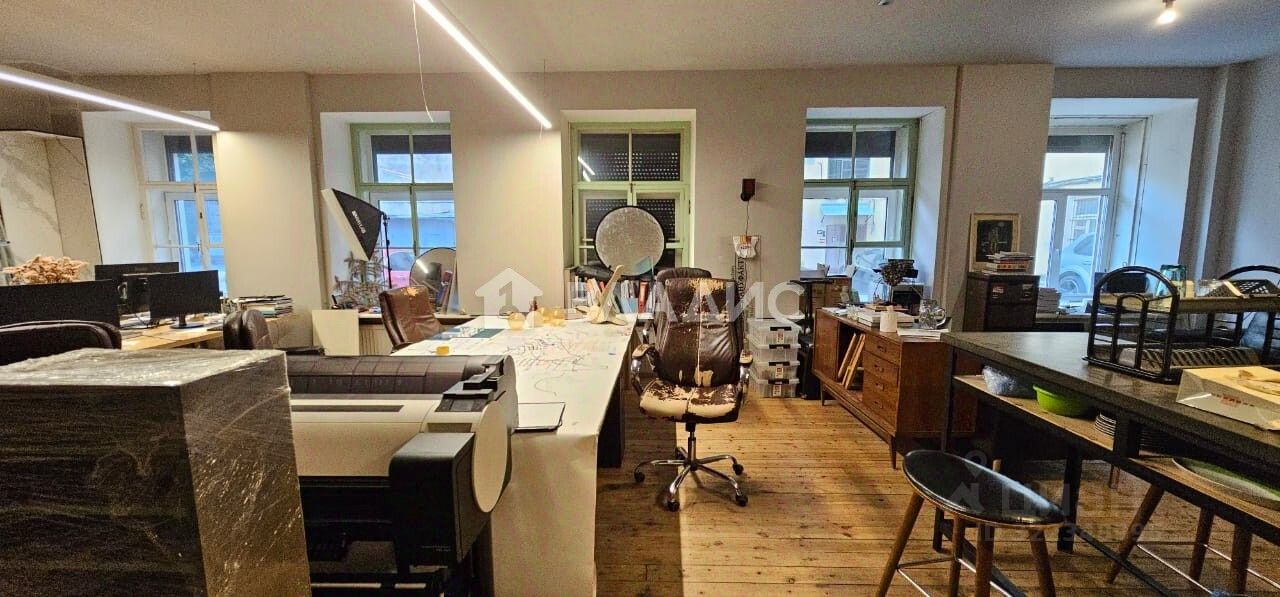 Квартира расположена на первом этаже пятиэтажного дома. Комнаты изолированы, высота потолков — 3,42 м. Окна выходят во двор, что обеспечивает комфортное естественное освещение.